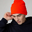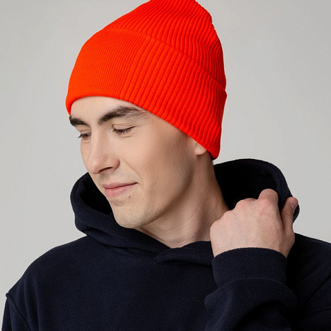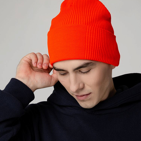 Двухслойная шапка фактурной вязки с отворотом и специальной более гладкой областью под вышивку.