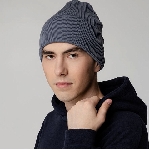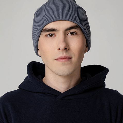 Двухслойная шапка фактурной вязки с отворотом и специальной более гладкой областью под вышивку.