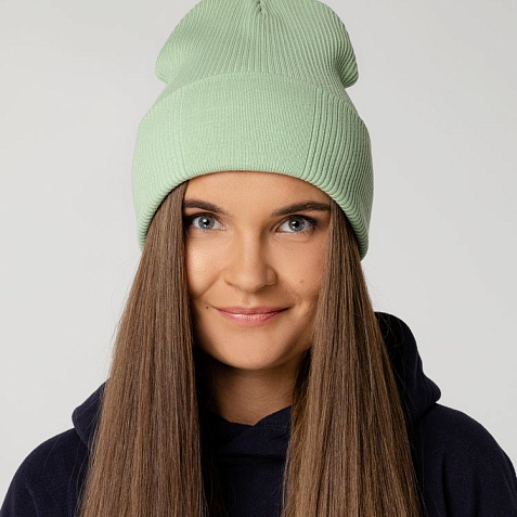 Двухслойная шапка фактурной вязки с отворотом и специальной более гладкой областью под вышивку.