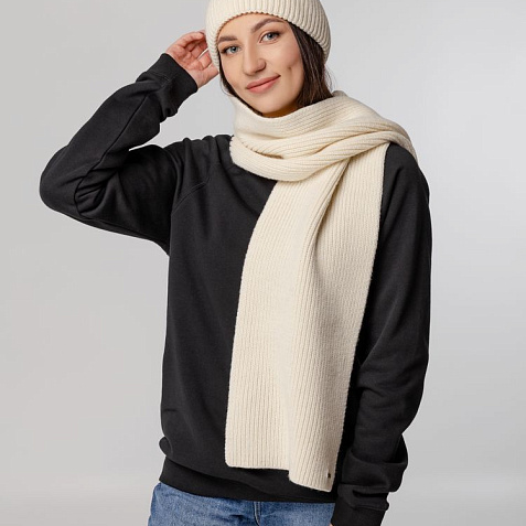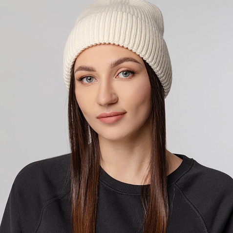 Шапка-бини из полушерстяной пряжи актуальных приглушенных оттенков. Трендовый фасон с удлиненным верхом — для расслабленного повседневного образа.