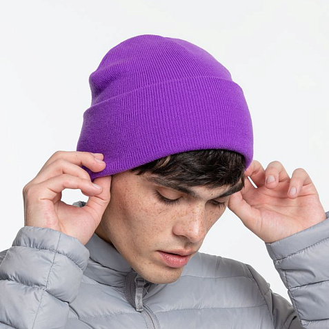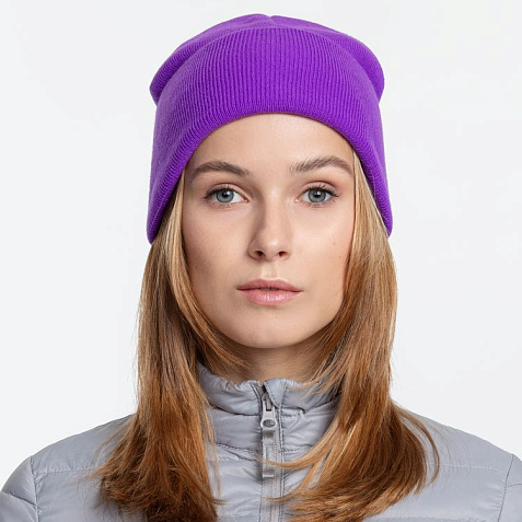 Двухслойная шапка из акриловой пряжи с регулируемым отворотом 7–10 см.