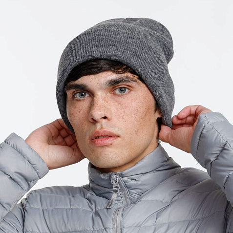 Двухслойная шапка из акриловой пряжи с регулируемым отворотом 7–10 см.