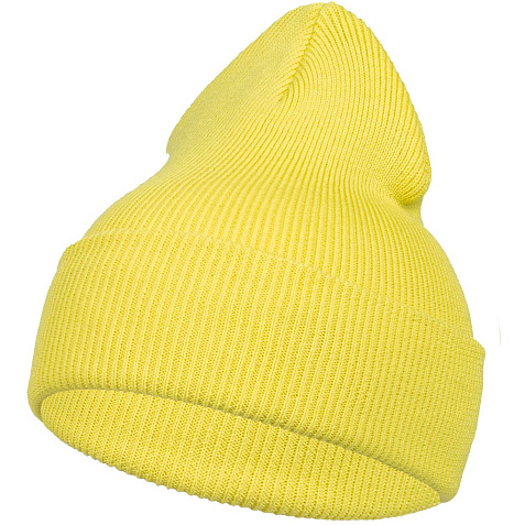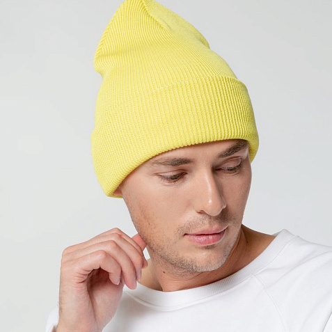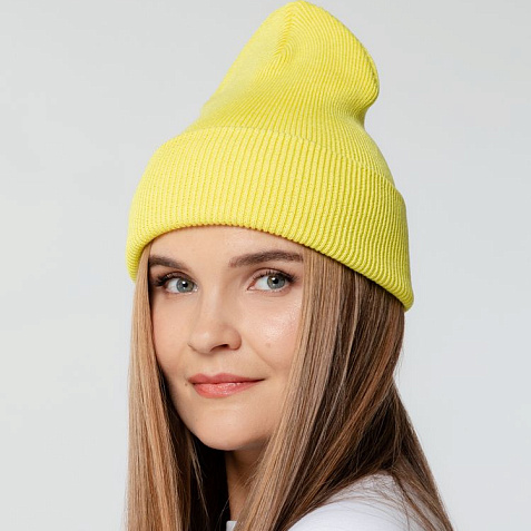 Двухслойная шапка, связанная резинкой, с широким отворотом.