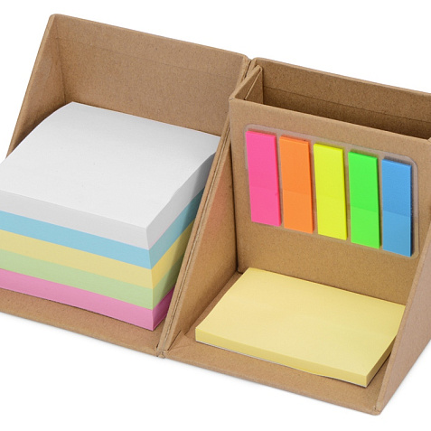 Удобный и удивительно компактный офисный аксессуар включает все необходимое для рабочего стола. Поможет организовать рабочее место, не занимая много пространства. В комплект входят: - подставка картонная, - бумажный блок для записей, - бумажный блок для записей с клеевым краем, - бумажные закладки с клеевым краем. Тампопечать (1 цвет (цветные изделия)) на данный товар осуществляется бесплатно. Оплачивается только настройка оборудования в размере 4500 рублей на весь тираж.