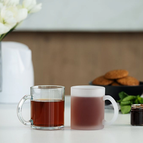 Стеклянная кружка классической формы с удобной ручкой. Подходит для сублимационной печати.