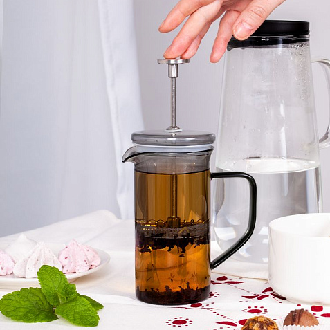 - Опустите пресс-фильтр: он плотно прижмет кофе или чайные листья ко дну колбы и не даст им попасть в напиток.