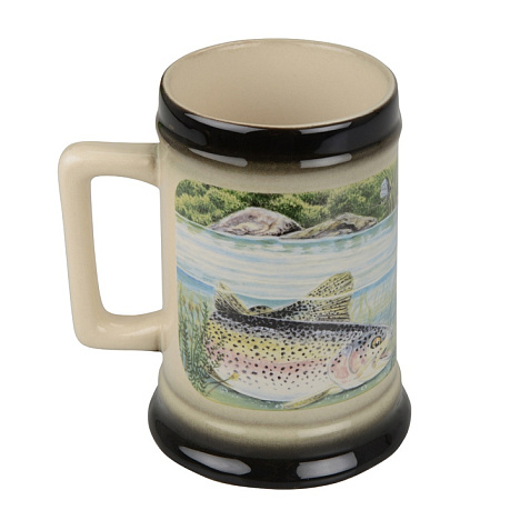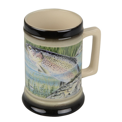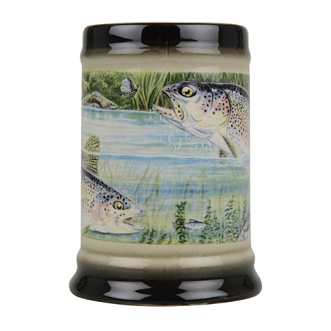 Удобная керамическая кружка украшена изображением рыбы в пруду. Кружка прекрасно подойдет в качестве подарка заядлым рыбакам. Красочное оформление по достоинству оценят любители необычных вещей.