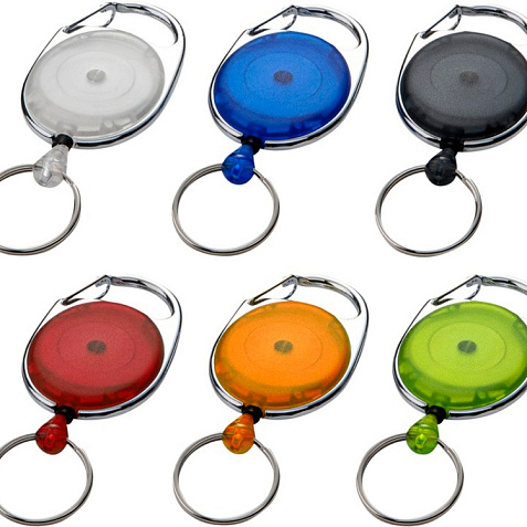 Брелок с ретрактором Demos идеальный предмет для любого офиса, торговой ярмарки, конференции или горнолыжного склона. Роликовая клипса оснащена карабином, а благодаря прочному механизму и шнуру длиной 60 см посетитель может легко прикрепить к нему бейдж.
