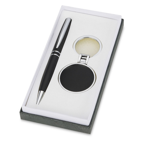 Набор обладает строгим, классическим сочетанием черного и серебристого цветов. Он отлично подчеркнет деловой стиль успешного руководителя. На брелок можно нанести логотип организации. Гравировка (оптоволоконный лазер) (Без чернения) на данный товар осуществляется бесплатно. Оплачивается только настройка оборудования в размере 2700 рублей на весь тираж.