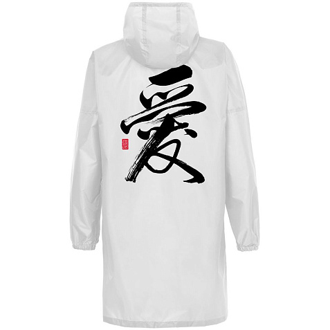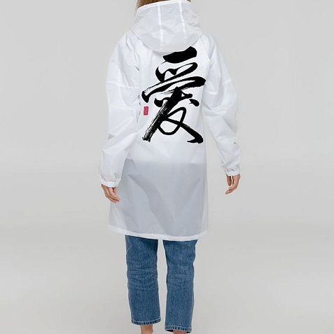 Иероглифы коллекции «Вечные ценности» выполнены в жанре каллиграфии на древнекитайском диалекте мандарин. Плавные линии символизируют внутренний баланс и фокусировку на главных жизненных ориентирах.Плащ-дождевик из ткани таффета на молнии с капюшоном. Складывается в мешочек — удобно брать с собой.