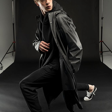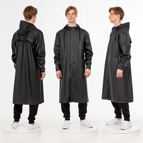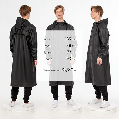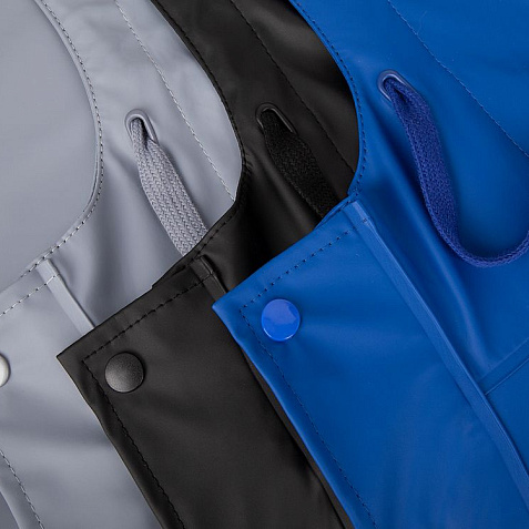 Плащ-дождевик с капюшоном из полиэстера с полиуретановым непромокаемым покрытием.