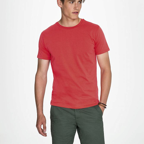 Кроеная мужская футболка с круглой горловиной. Ворот в тонкую резинку с укрепляющей тесьмой. Облегающий силуэт.