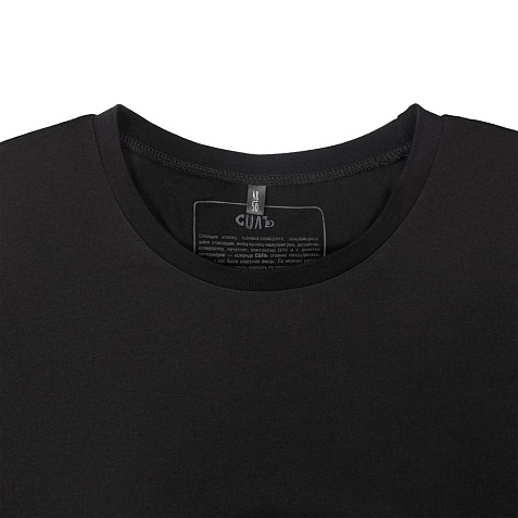 На изнаночной стороне футболки напечатан принт с информацией о бренде и инструкцией по уходу за изделием.