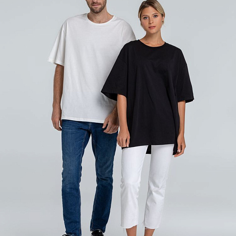 Футболка унисекс со спущенным плечом и круглым вырезом, отделанным резинкой.