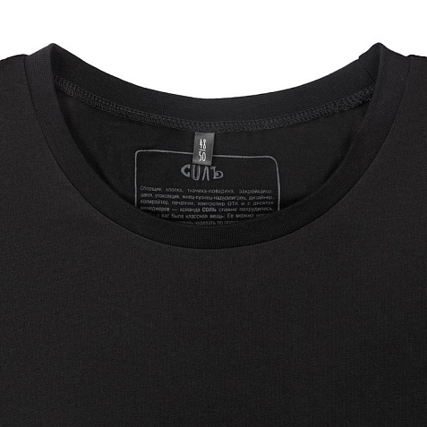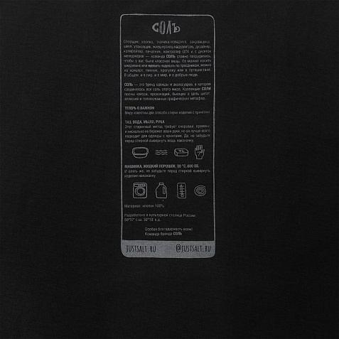 Принт с информацией о бренде и инструкцией по уходу за изделием на изнаночной стороне футболки.