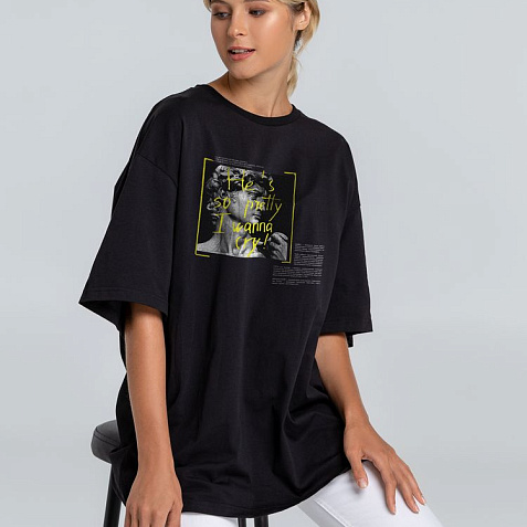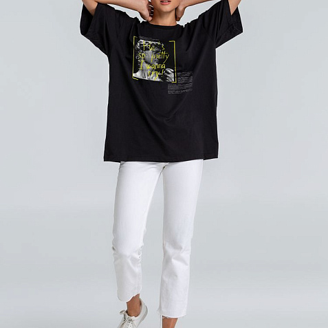 Футболка унисекс со спущенным плечом и круглым вырезом, отделанным резинкой.