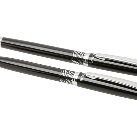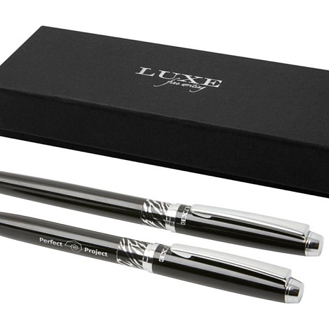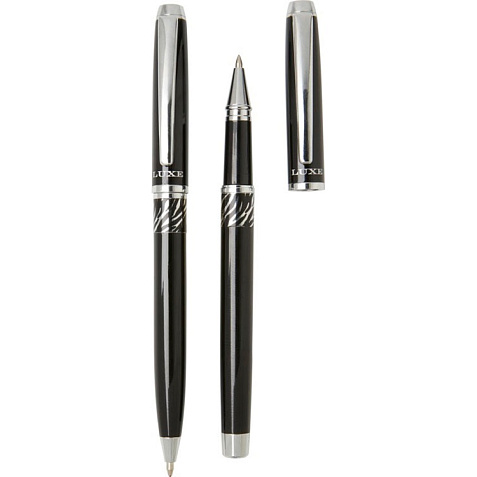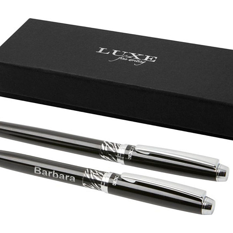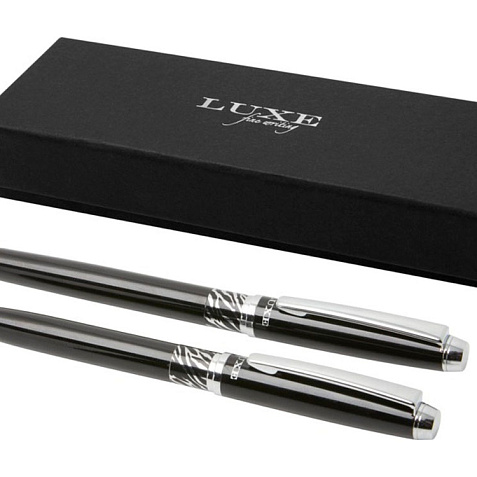 Шариковая ручка и ручка-роллер с декоративным узором на корпусе. Шариковая ручка предварительно заполнена синими чернилами, а ручка-роллер предварительно заполнена черными чернилами. Упакована в подарочную коробку LUXE. Латунь.