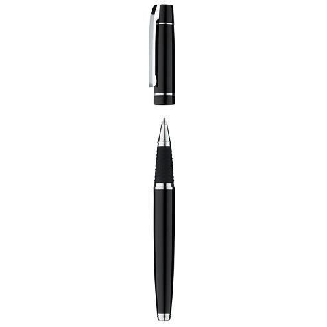 Металлическая ручка-роллер с пружинным клипом и нескользящей прорезиненной зоной захвата черного цвета. Фурнитура с глянцевой хромированной отделкой. Европейский стержень с наконечником из нержавеющей стали и вольфрамово-карбидным шариком (0,7 мм). Длина письма: примерно 800 м. Немецкие чернила. Произведено в Германии. Стержни для шариковых ручек Uma не высыхают даже при снятом колпачке. Именно поэтому мы подтверждаем экстра длительное время „cap-off. Гравировка (оптоволоконный лазер) (Без чернения) на данный товар осуществляется бесплатно. Оплачивается только настройка оборудования в размере 2700 рублей на весь тираж.
