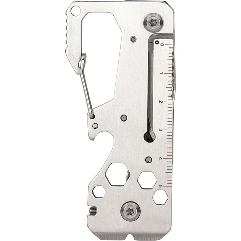 Многофункциональный инструмент с корпусом из прочной нержавеющей стали содержит 13 функций. Инструменты: • консервный нож • отвертка • линейка • открывалка для бутылок • гаечные ключей для гаек • пила • карабин - 13 функций - нержавеющая сталь Гравировка (оптоволоконный лазер) (Без чернения) на данный товар осуществляется бесплатно. Оплачивается только настройка оборудования в размере 2700 рублей на весь тираж.