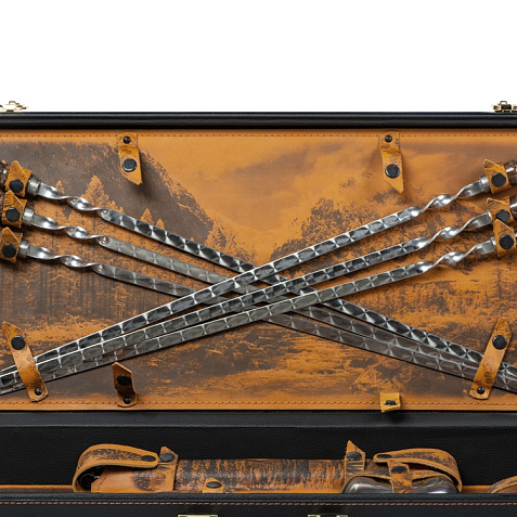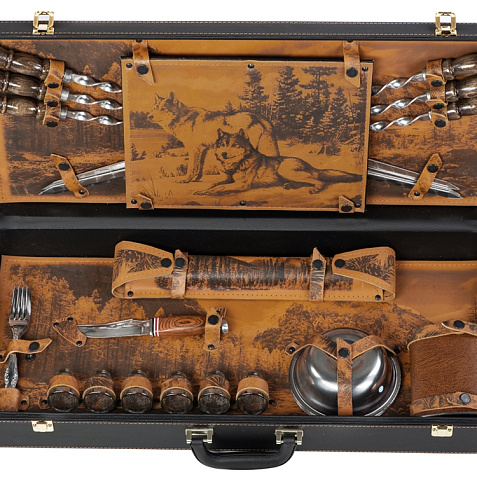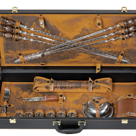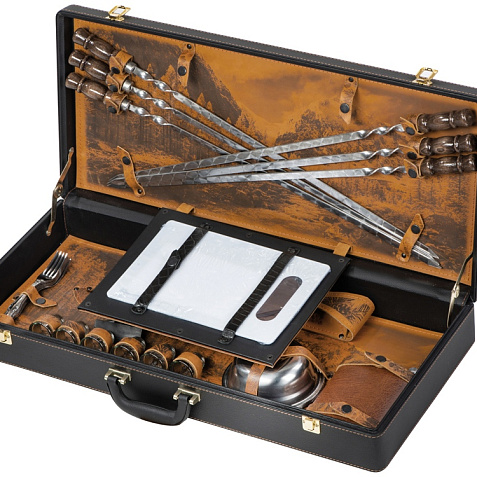 Кейс из сплит-кожи, с повышенной износостойкостью, внутренняя отделка натуральная кожа с художественным выжиганием. В комплект входит: - шампура большие d2,7 х 66 см - 6 шт - шампура маленькие 34,5 х 1 х 1,9 см- 6 шт - доска разделочная 29,5 х 20 см - вилка 19 х 2,5 х 1,8 см- 6 шт - нож 23 х 2,8 х 2,5 см - стопка d4,2 х 5 см (40 мл)- 6 шт - тарелка d15 х 5 см- 6 шт - фляга 12,4 х 4 х 16 см - мангал 24,5 х 34,7 х 16,7 см Шильд спектрум (Шильд спектрум) на данный товар осуществляется бесплатно. Оплачивается только настройка оборудования в размере 1100 рублей на весь тираж.
