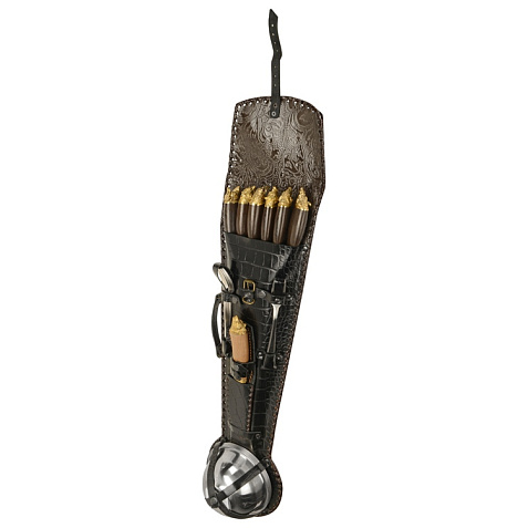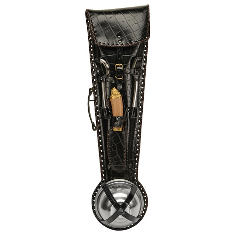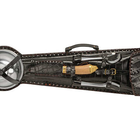 Набор для пикника в кожаном чехле ручной работы. В комплект входит: Тарелка 500 мл d16 х 7 см - 6шт Стопка d5,2 х 6 см - 6шт Нож 28,5 х 4 х 2,5 см - 1шт Ложка 19,3 х 4,5 х 3 см - 6шт Вилка 19,3 х 2,5 х 2 см - 6шт Топор 39,5 х 14,5 х 3,2 см - 1шт Ножки для мангала 50,5 х 31 х 1 см - 2шт Шампур 68 х 4 х 2,5 см - 6шт