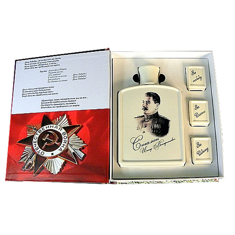 День Победы - один из самых важных и памятных государственных праздников в нашей стране. В этот знаковый для России день принято дарить памятные сувениры. Подарочный набор День Победы - это великолепный подарок на 9 мая, который запомнится надолго. Подарочный набор стилизован под книгу и состоит из штофа с изображением генералиссимуса И. В. Сталина и трех рюмок с патриотическими тостами За Россию, За Родину”, За победу”. Все сувениры выполнены из высококачественной керамики, поэтому они еще долго будут служить и радовать глаз. Этот подарочный набор станет прекрасным дополнением к праздничному столу. Внимание! Данное изделие относится к категории повышенной хрупкости. Для обеспечения его целостности и безопасной транспортировки настоятельно рекомендуется использование обрешетки. Обрешеточная упаковка является обязательной при доставке, и компания Oasis не несёт ответственности за повреждения, возникшие в результате ненадлежащей упаковки или транспортировки без обрешетки.