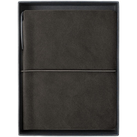 Ежедневник из искусственного материала, напоминающего замшу, и ручка с покрытием софт-тач, которая удобно прячется за обложку ежедневника.