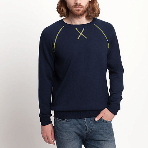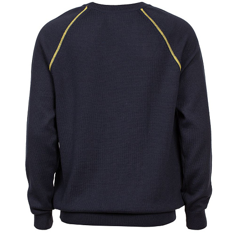 Джемпер чулочной вязки с круглым воротом и контрастной строчкой.