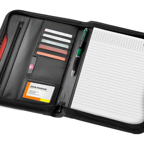 Папка с застежкой-молнией, держателем для пучки, карманом на молнии, отделениями для документов и блокнотом А4 с 20 страницами линованной бумаги. Ручка и принадлежности не включены.