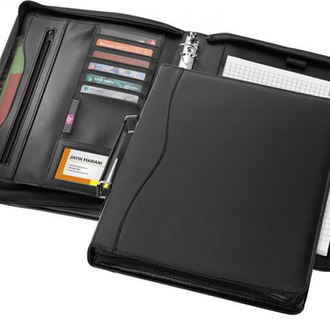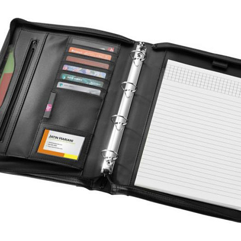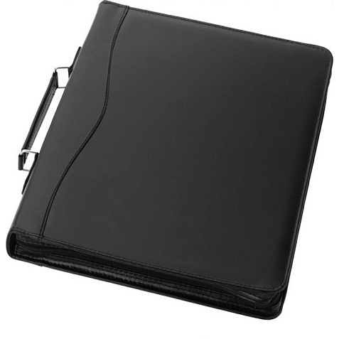 Папка с ручкой, застежкой-молнией, регистратором, карманом на молнии и отделениями для документов. Включает блокнот А4 с 20 страницами линованной бумаги. Ручка и принадлежности не включены. Тиснение (Блинт) на данный товар осуществляется бесплатно. Оплачивается только настройка оборудования в размере 8700 рублей на весь тираж.
