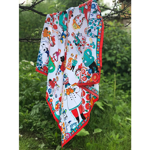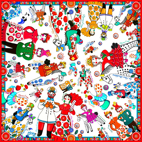 Дымковская игрушка - это один из самых старинных промыслов России, существующий более четырёхсот лет. Нарядная и жизнерадостная, она ценит компанию, радость и задор. Именно такое настроение несёт в себе дизайн платка с изображением милых и таких родных сердцу образов. Забудьте про одиночество, уныние и хандру: в таком платке захочется улыбаться и парить в воздухе не только Вам, но и окружающим! Насыщенные, глубокие цвета, искренность и теплота народного искусства - история России ещё никогда не была столь выразительной и красноречивой. Советы по уходу: -Наши платки сделаны с душой и нуждаются в ответной душевной заботе и внимании. -Они практически не мнутся, очень приятные на ощупь, нежные и мягкие. Любят бывать на людях, посещать светские мероприятия, не выносят одиночества. -Всегда готовы к экспериментам и смелым сочетаниям. Прослужат верой и правдой долгие годы, никогда не выйдут из моды и всегда будут уместны и кстати. -Ручная стирка 40 градусов.