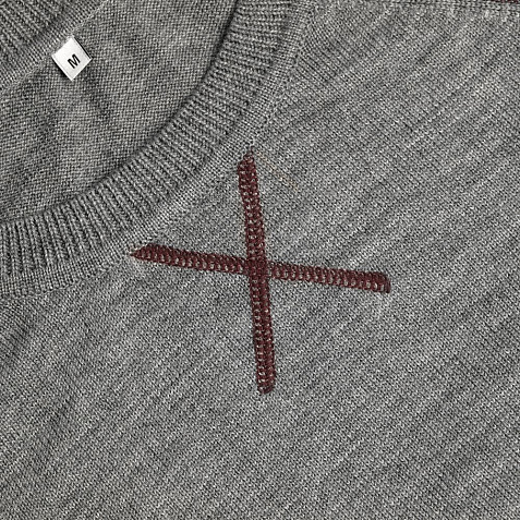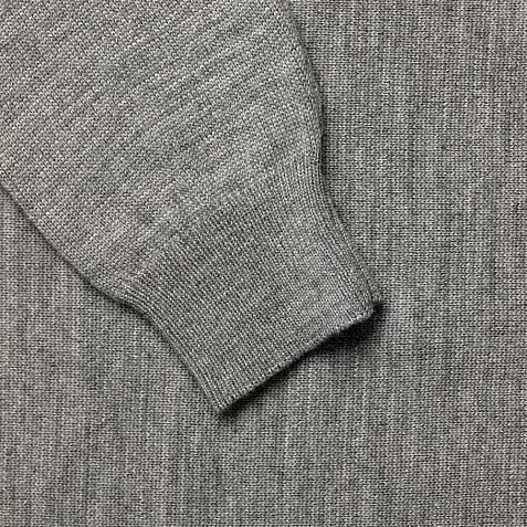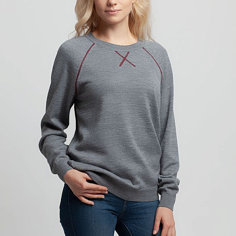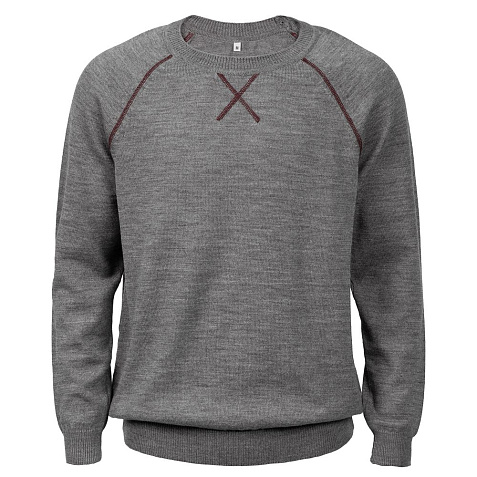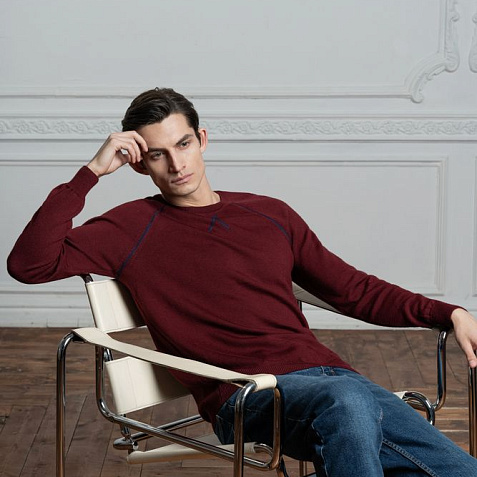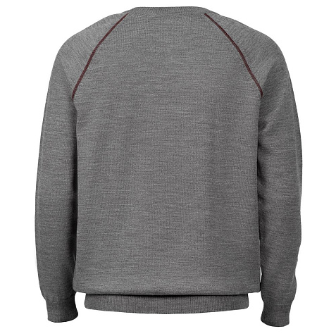 Джемпер чулочной вязки с круглым воротом и контрастной строчкой.
