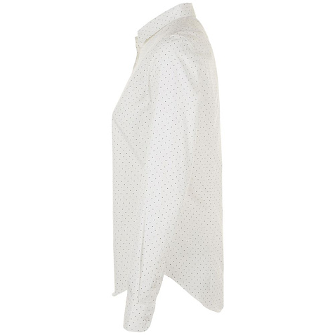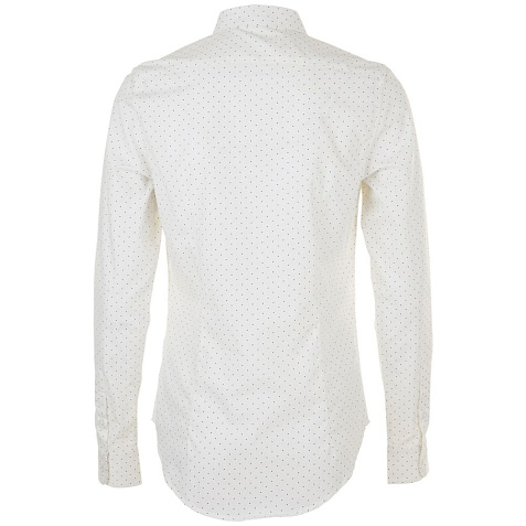 Модная рубашка с печатным рисунком в горошек, которая прекрасно впишется в современный корпоративный стиль.Приталенная модель с нагрудными вытачками, маленьким классическим воротничком, планкой с 7 пуговицами тон в тон и манжетами на 1 пуговице с разрезом «капуцин».