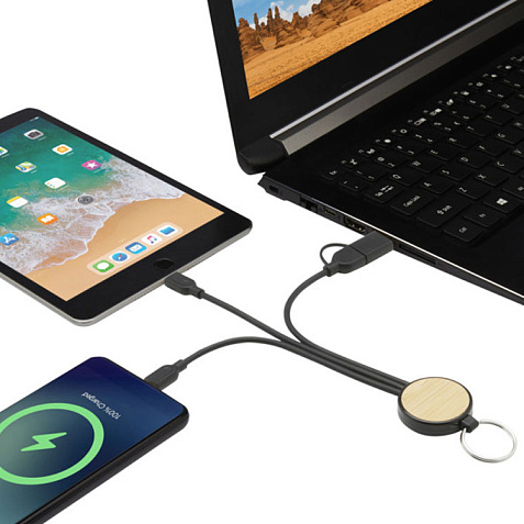 Зарядный кабель Tecta 6 в 1 из бамбука и переработанного пластика демонстрирует, где экологичность сочетается со стилем. Кабель длиной 25 см из переработанного TPE-пластика обеспечивает мощность зарядки 2 А. Входная мощность: USB A и Type-C. Выход: Type-C, micro USB и двойные наконечники 2 в 1 micro USB и Lightning, совместимые как с устройствами iOS, так и с устройствами Android. Алюминиевые наконечники USB обеспечивают надежное и стабильное соединение, гарантируя надежную зарядку каждый раз. Серебряный брелок из нержавеющей стали служит удобным способом для организации и переноски кабеля. Упакован в конверт из крафт-бумаги.