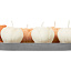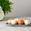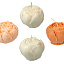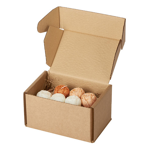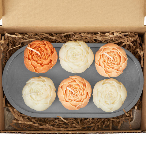 три белых свечи пион, одна темно-персиковая свеча пион, две персиковые свечи пион, подставка гипсобетон, упаковочный материал