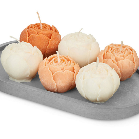 Набор из шести ароматических свечей в форме пионов поможет наполнить ваш дом нежностью и уютом. Природный дизайн в сочетании с графитово-серой подставкой из гипсобетона подойдет к любому интерьеру. В наборе три белых свечи со сладким ароматом французской ванили, две персиковых с согревающими и укутывающими нотками перца, нероли и амбры и одна темно-персиковая, обладающая свежим и успокаивающим запахом лаванды. Это позволяет выбрать аромат под настроение. Свечи на 80% изготовлены из натуральных соевого и кокосового воска, не токсичны при горении и не вредны для дыхания. После того как свечи прогорят, подставку можно использовать для пало санто или других благовоний, а также для хранения различных мелочей или ювелирных украшений. - Элегантный дизайн - Многофункциональная подставка из гипсобетона - Экосостав - Ручная работа Тампопечать (1 цвет (цветные изделия)) на данный товар осуществляется бесплатно. Оплачивается только настройка оборудования в размере 4500 рублей на весь тираж.