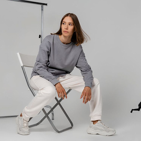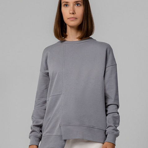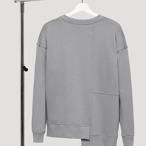 Свитшот унисекс свободного кроя со спущенным плечом и нестандартным нижним краем.