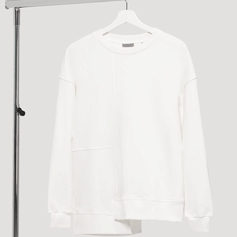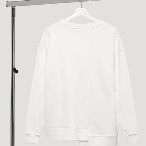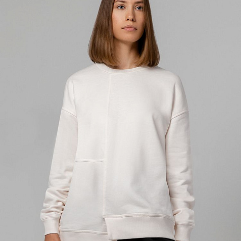 Свитшот унисекс свободного кроя со спущенным плечом и нестандартным нижним краем.