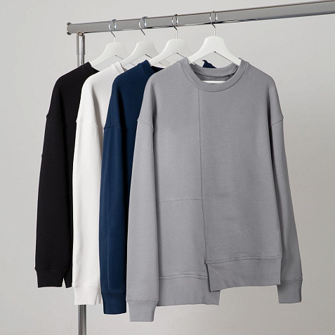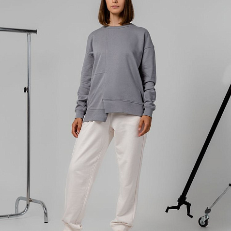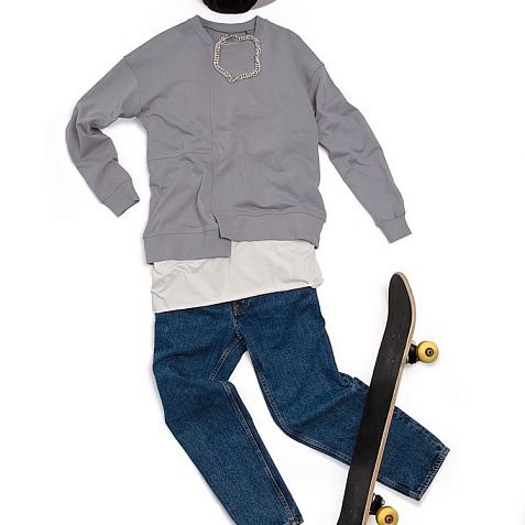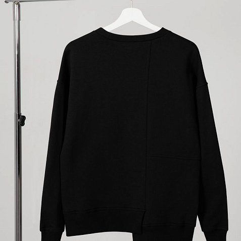 Свитшот унисекс свободного кроя со спущенным плечом и нестандартным нижним краем.