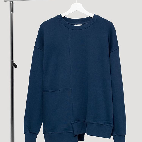 Свитшот унисекс свободного кроя со спущенным плечом и нестандартным нижним краем.