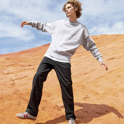 Плотный свитшот унисекс свободного кроя со спущенным плечом и широким поясом.