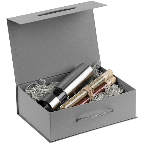 Коробка выполнена из переплетного картона, кашированного гладкой дизайнерской бумагой Malmero, с крышкой на магните.