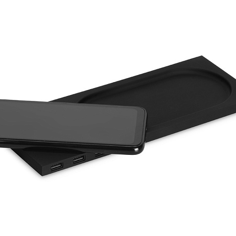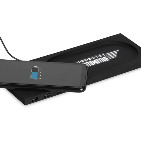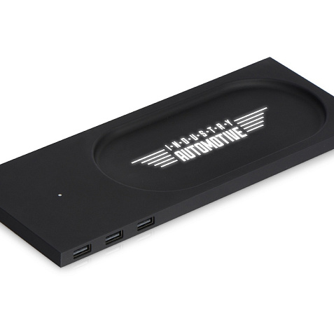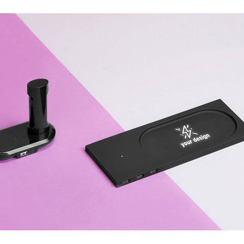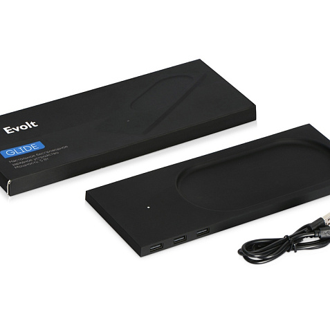 Беспроводное настольное зарядное устройство Glide выполнено из пластика с покрытием soft-touch. Кроме функции беспроводной зарядки имеет также 3 зарядных USB-разъема. Компактный органайзер имеет отсек для мелочи. После гравировки на устройстве вскрывается белый цвет подсветки, что позволяет сделать необычную и стильную персонализацию на этом гаджете. Гравировка (CO2 лазер) (Без чернения) на данный товар осуществляется бесплатно. Оплачивается только настройка оборудования в размере 2700 рублей на весь тираж.