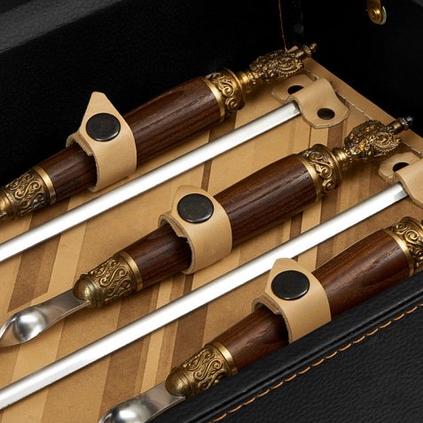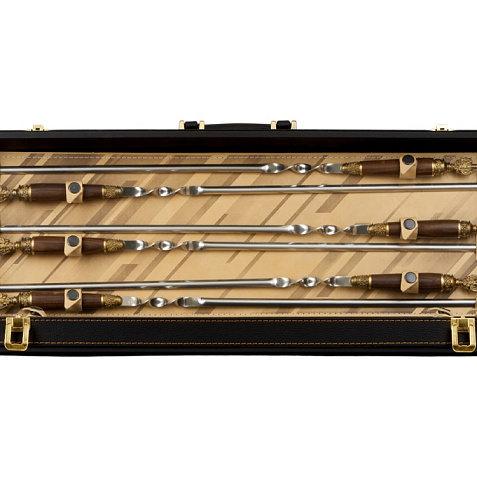 стопки- хрусталь/литье, шампура- нержавеющая столь/дерево, дипломат- сплит кожа