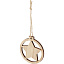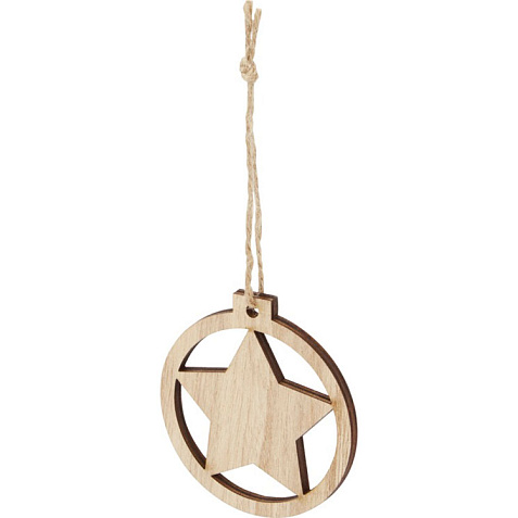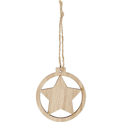 Деревянное украшение круглой формы со звездой внутри, с петлей и шнурком. Упаковано с открыткой из крафт-бумаги на обратной стороне.