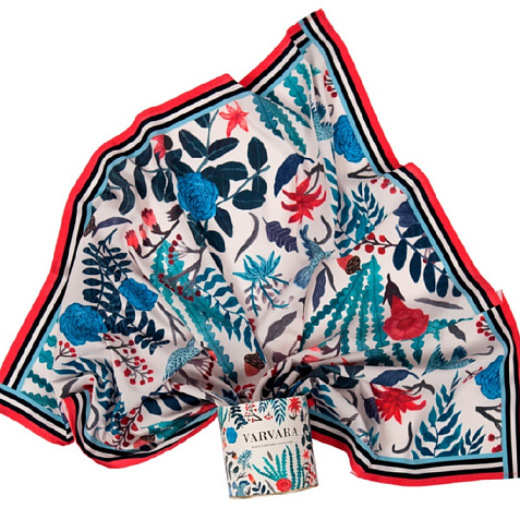 Платок из искусственного шелка саржевого плетения (твил) размером 70*70 см., с авторским принтом Голубые розы. Авторский принт написан художницей вручную специально для российского бренда Varvara. Художница размышляла на тему русской природы, культуры и искусства: в основе принта лежат листья папоротника, соцветия клюквы, бутоны розы и загадочные птицы. Композиция рисунка напоминает иллюстрацию к русским сказкам. Платок упакован в подарочный тубус. Бережный уход. Ручная стирка при температуре не выше 30 градусов. Заливка полимерной смолой (Смола) на данный товар осуществляется бесплатно. Оплачивается только настройка оборудования в размере 3600 рублей на весь тираж.
