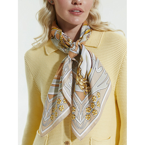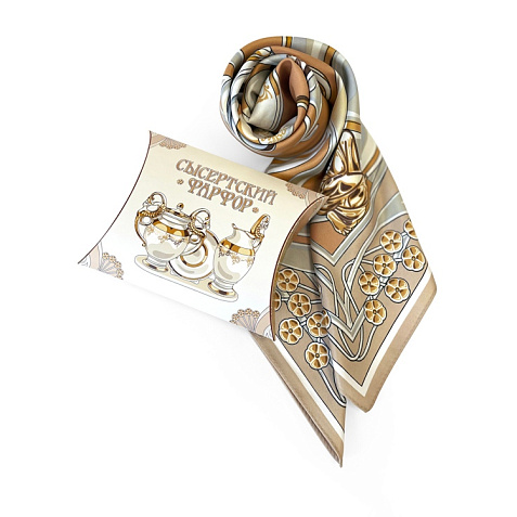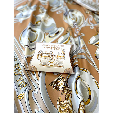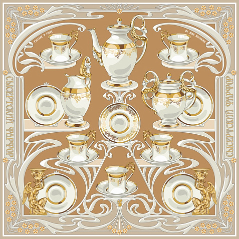Платок Сысертский фарфор от дизайнера Нины Ручкиной посвящается уральскому народному промыслу, известному с 19 века. Композиция платка словно сказочный лабиринт увлекает за собой, вызывая желания рассматривать детали утонченного сервиза работы уральских мастеров. Изящные фарфоровые предметы расположены в ажурном серванте эпохи модерна. Сочетания благородного золота и слоновой кости, плавные линии и стилизованные цветы рождают необычайно элегантный дизайн авторского аксессуара. Такой платок привнесет дополнительный шик как в базовый гардероб, так и в вечерний стиль. Отголоски многоликого русского модерна, декоративность и символизм, история России и современный дизайн превращают этот платок в великолепный подарок со смыслом. Над дизайном работали: Нина Ручкина, Наталия Александрова.
