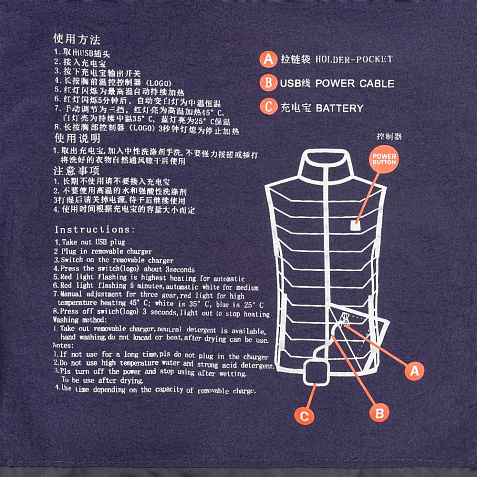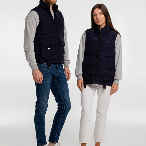 Утепленный жилет со встроенным нагревательным элементом из углеродного волокна в области спины и шеи. Работает от внешнего аккумулятора (в комплект не входит), подарит ощущение тепла и комфорта в любую погоду.