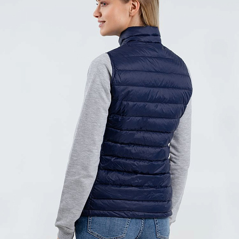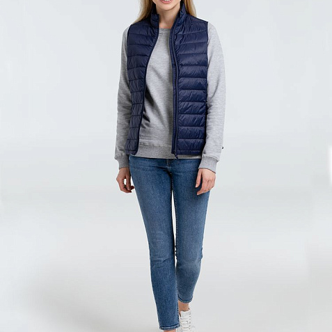 Женский стеганый жилет облегающего кроя на молнии с воротником-стойкой.
