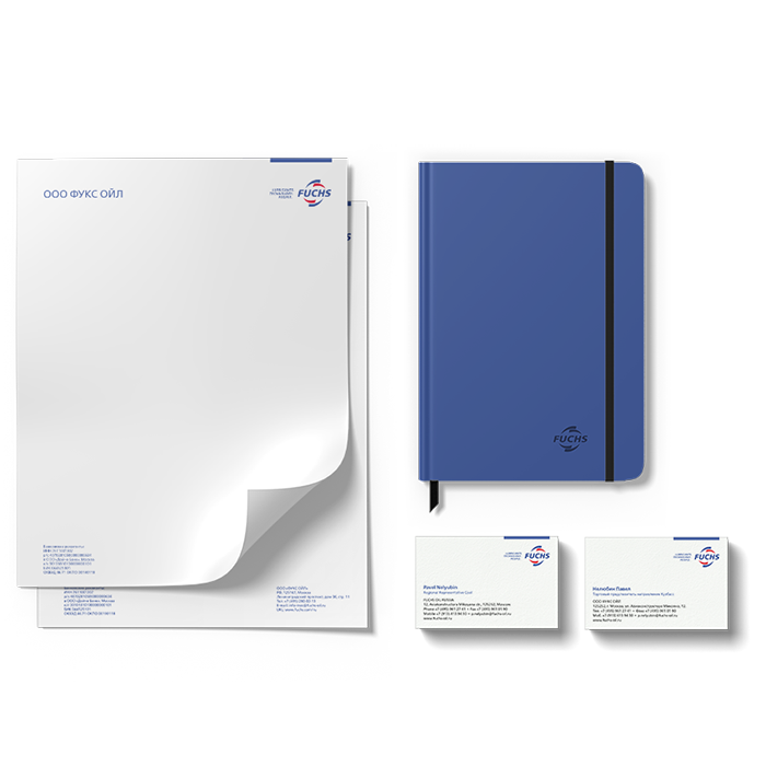 Дизайнеры Cosmo создали макеты полиграфии на основе фирменного стиля компании Fuchs Oil. Были напечатаны бланки и визитки, забрендированы ежедневники методом минималистично бинтового тиснения. В качестве сувенирной продукции для дистрибьюторов из каталога Cosmo были выбраны пакеты и бейсболки в нескольких цветах, кружки, флешки, повербанки.